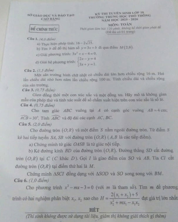 2. Đề thi tuyển sinh lớp 10 môn Toán Cao Bằng 2025 - 2026