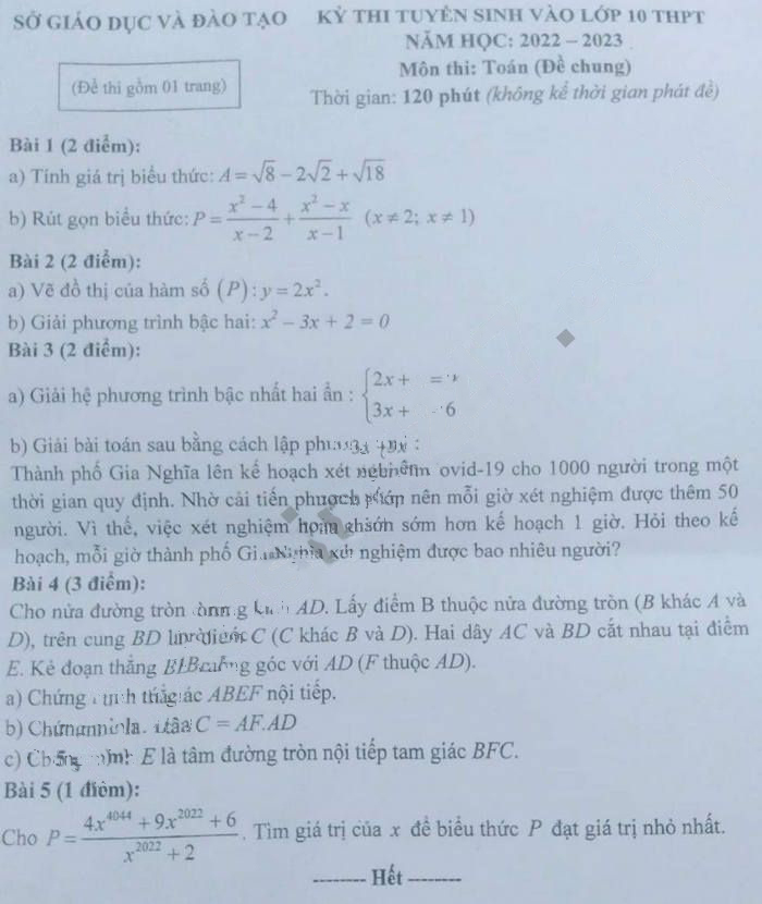 Đề thi tuyển sinh lớp 10 môn Toán tỉnh Đắk Nông 2022