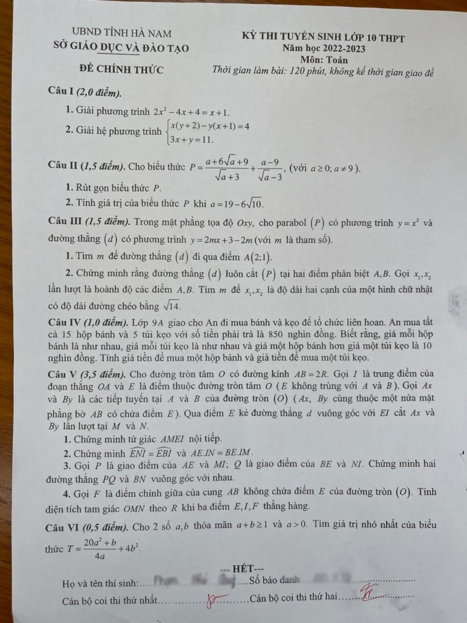 Đề thi vào 10 môn Toán Hà Nam 2022