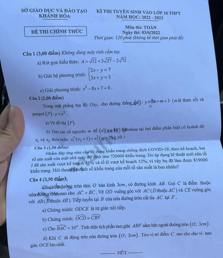 - Đề thi tuyển sinh lớp 10 môn Toán Khánh Hòa 2022