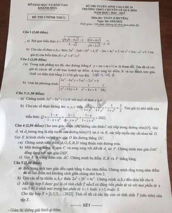 Đáp án đề thi vào 10 môn Toán Khánh Hòa 2022