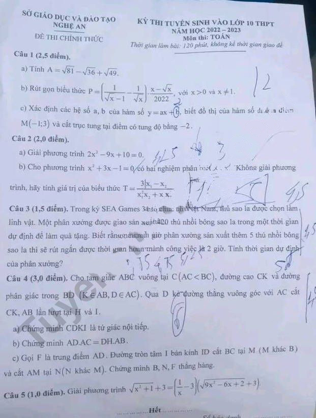 Đáp án đề Toán vào 10 Nghệ An 2023 đang được các thầy cô giải. Các em chú ý theo dõi.