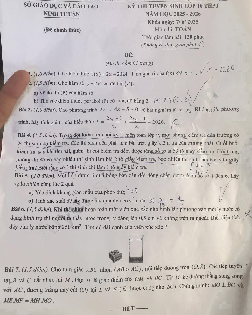 Đáp án đề thi vào 10 Ninh Thuận môn Toán 2023 đang được các thầy cô giải. Các em chờ 1 lúc rồi nhấn F5 để xem đáp án.