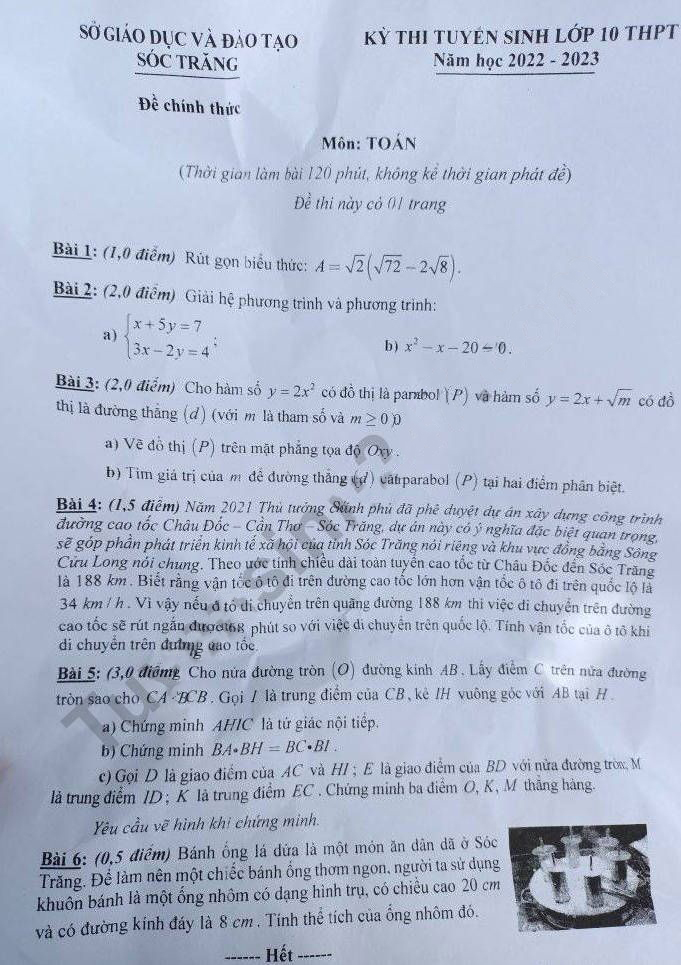 8. Đề thi vào 10 môn Toán Sóc Trăng 2022