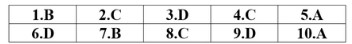 | 1. A | 2.B | 3.B | 4.C | 5.B | 6.A | 7.C | 8.D | 9.A | 10.D |
