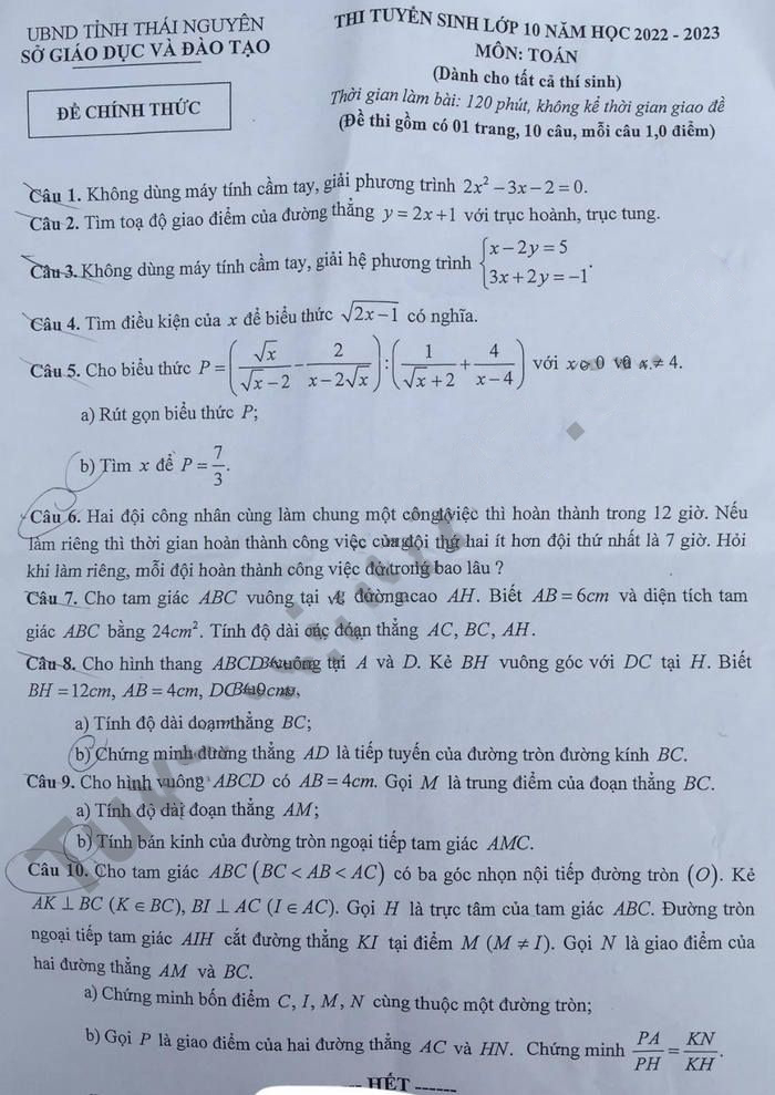 Đề thi vào 10 môn Toán Thái Nguyên 2023