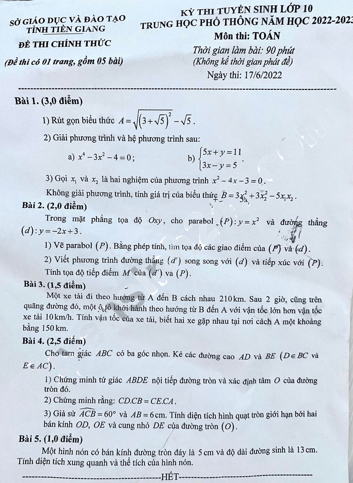 Đề thi vào lớp 10 2022 môn Toán Tiền Giang