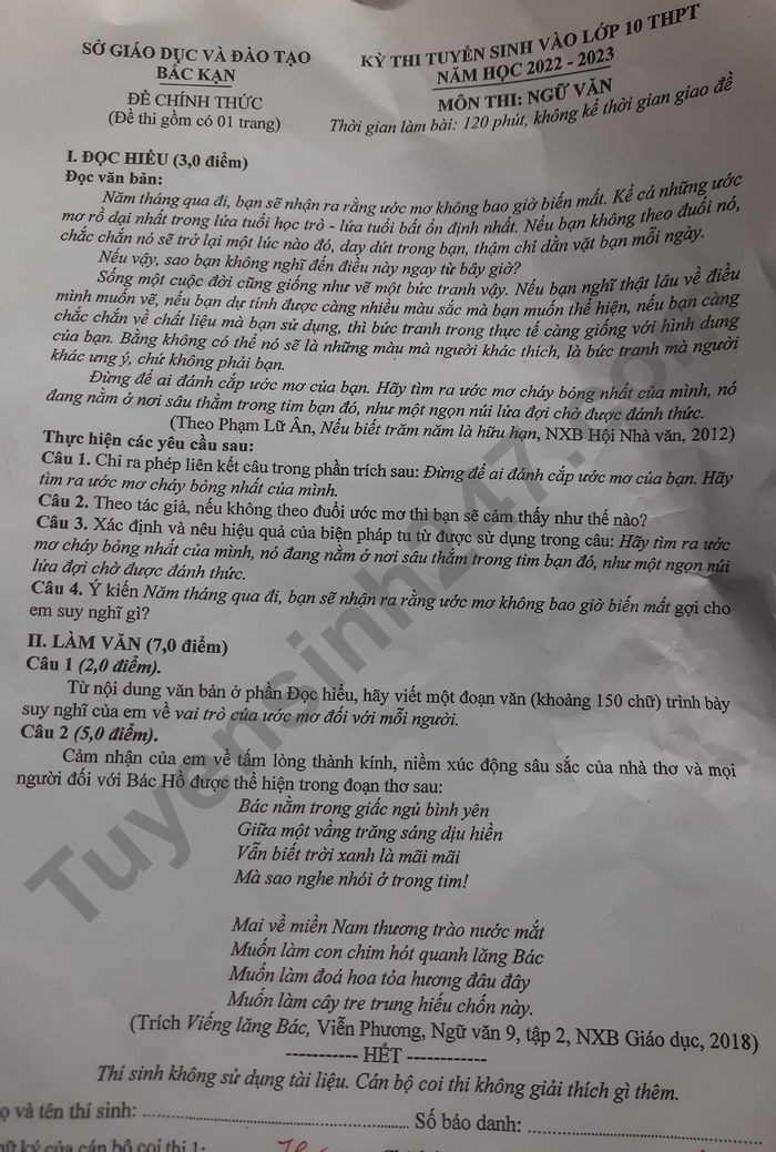 6. Đề thi vào lớp 10 môn Văn Bắc Kạn 2023