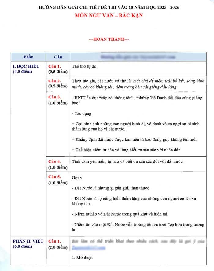 1. Đáp án đề thi tuyển sinh vào 10 môn Văn Bắc Kạn 2025-2026
