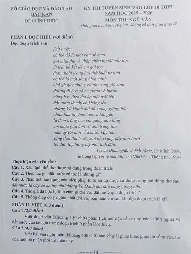 2. Đề thi tuyển sinh vào 10 môn Văn Bắc Kạn 2025-2026