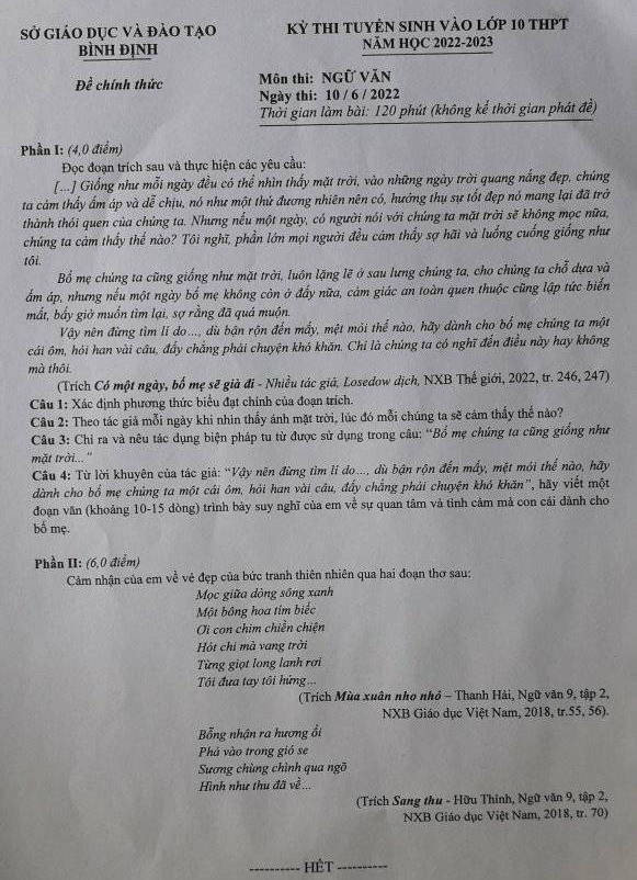 - Đề thi vào lớp 10 môn tiếng Văn Bình Định 2023