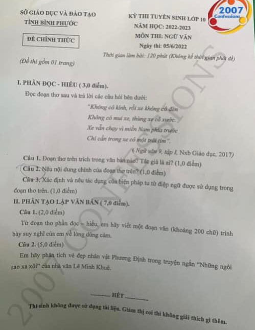 - Đề thi Văn vào lớp 10 2022 tỉnh Bình Phước