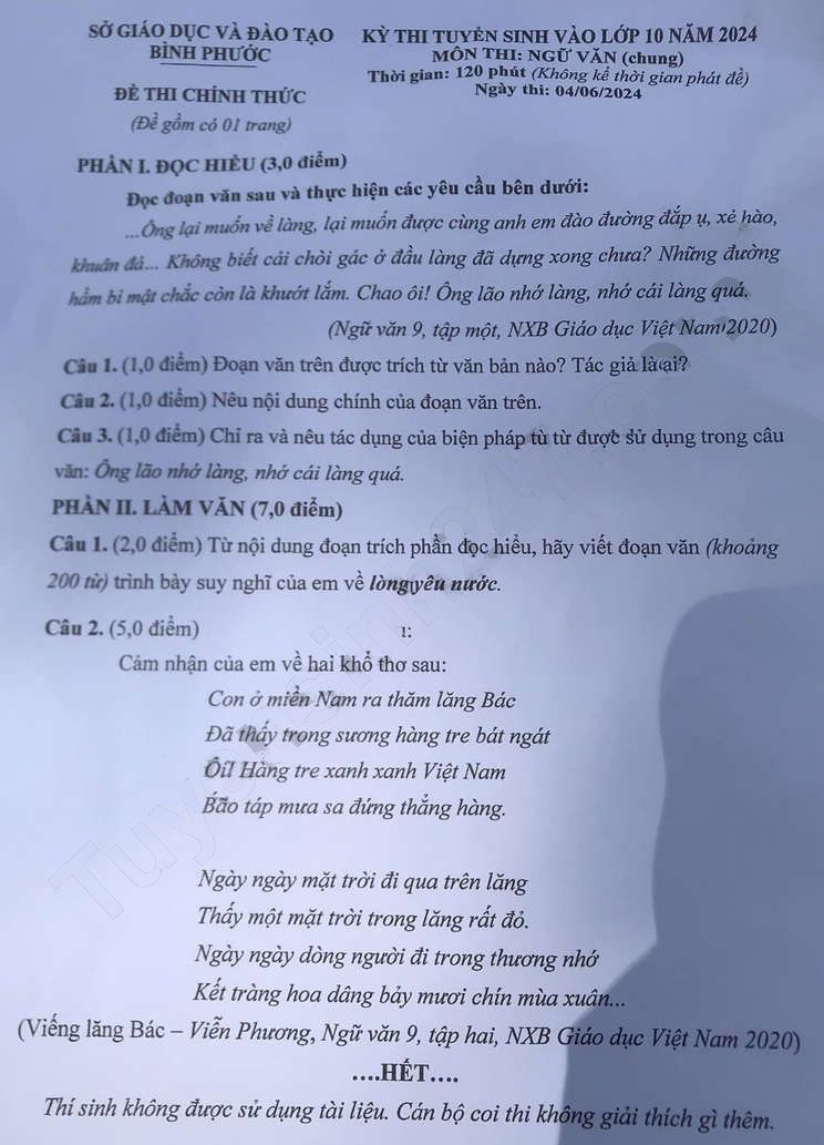 - Đề thi tuyển sinh lớp 10 môn Văn Bình Phước 2024