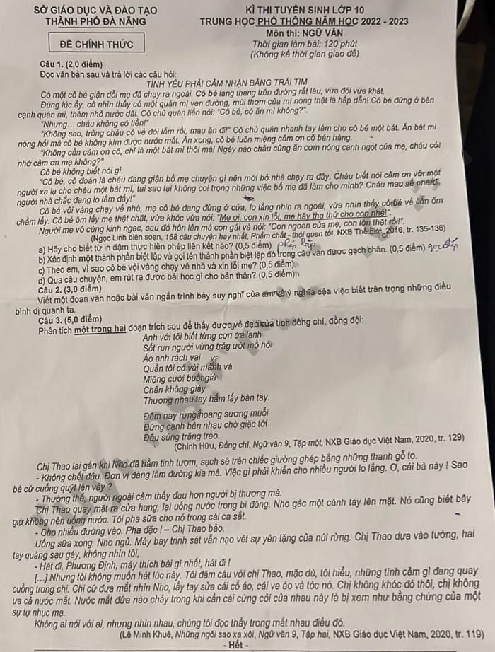 Đề thi vào 10 môn Văn 2022 Đà Nẵng