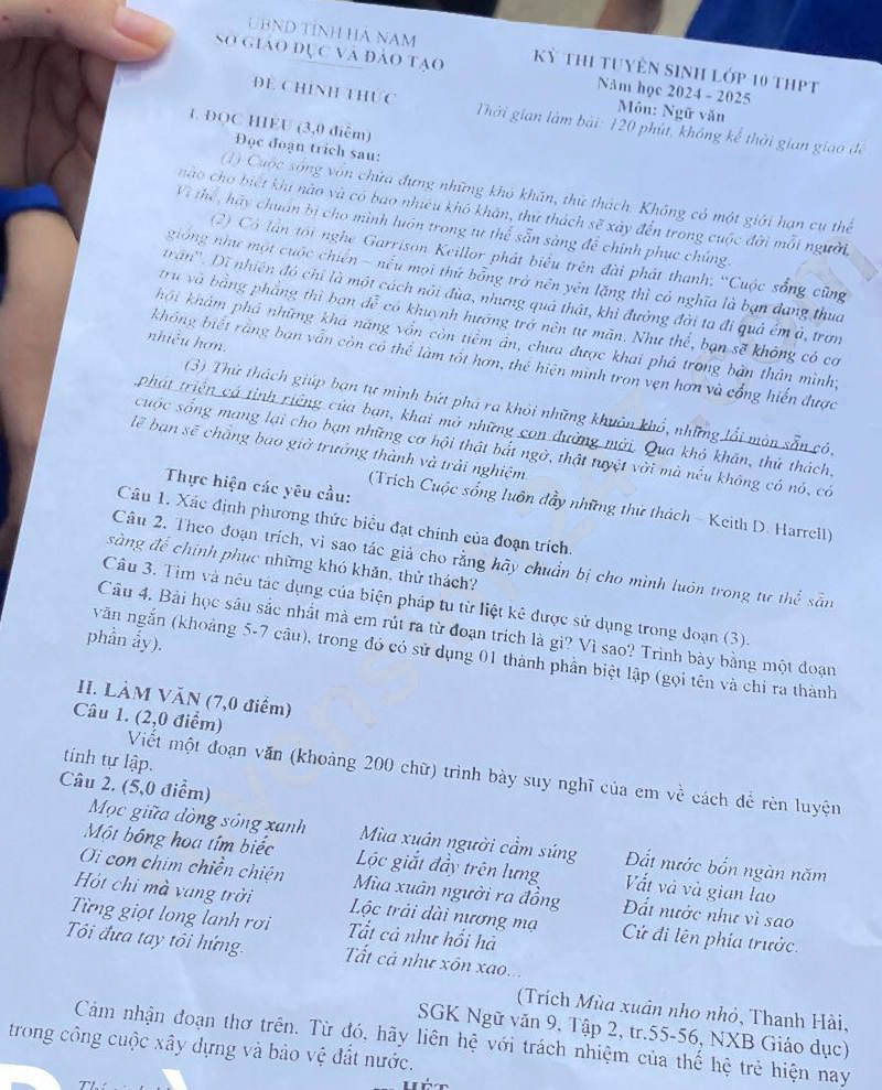 - Đề thi tuyển sinh lớp 10 môn Văn Hà Nam 2024