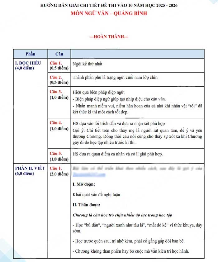 1. Đáp án đề thi Văn vào lớp 10 Quảng Bình 2025-2026