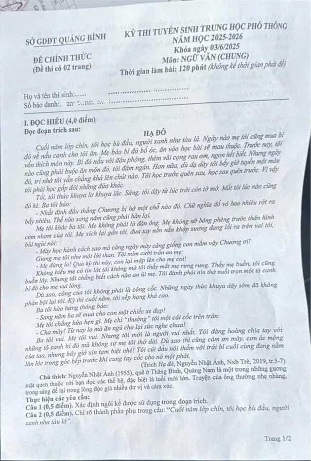 2. Đề thi Văn vào lớp 10 Quảng Bình 2025-2026