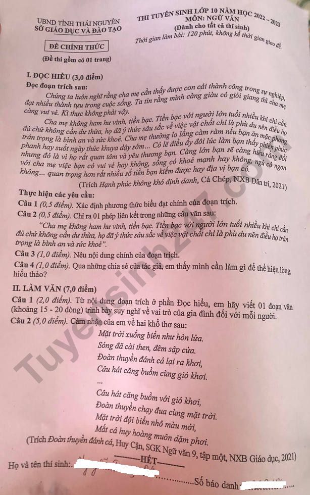 Đề thi tuyển sinh lớp 10 môn Văn Thái Nguyên 2023