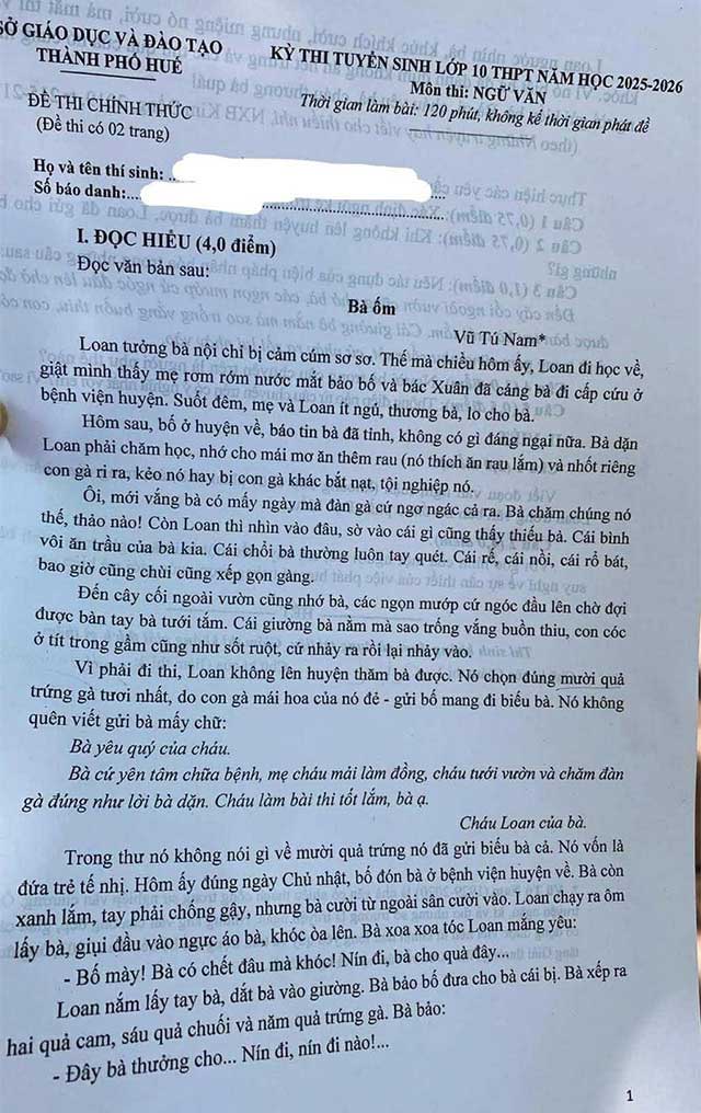 Đề thi Văn vào 10 năm 2025 tỉnh Thừa Thiên Huế