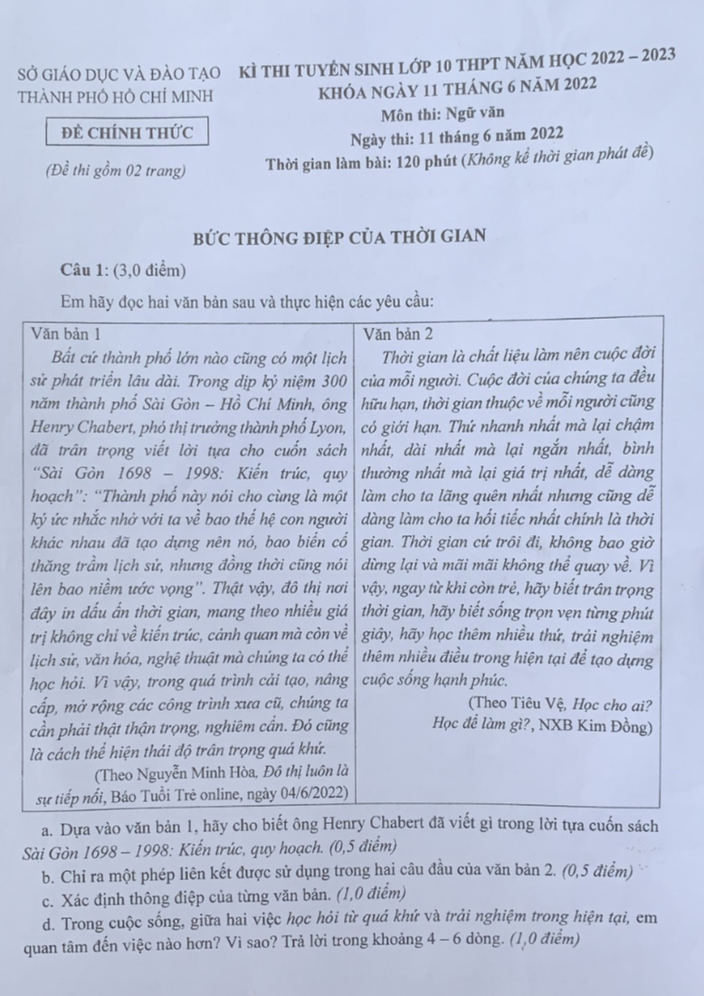 - Đề thi vào lớp 10 năm 2022 môn Văn Tp HCM