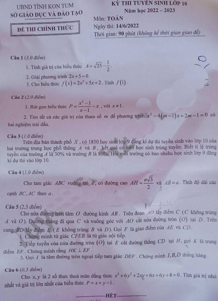 7. Đề thi vào 10 môn Toán Kon Tum 2022