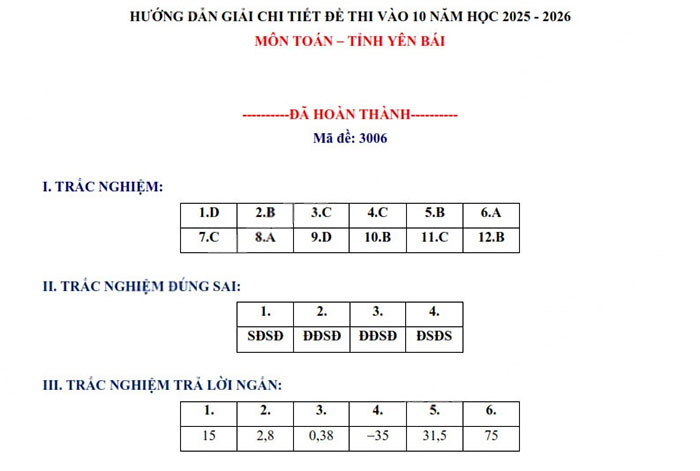 Đáp án đề thi vào lớp 10 môn Toán tỉnh Yên Bái 2025