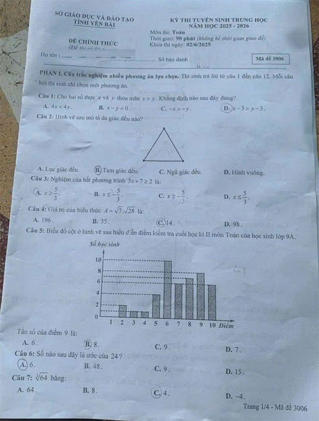 Ngày 2/6/2025 các thí sinh lớp 9 trên địa bàn tỉnh Yên Bái sẽ chính thức bước vào kì thi tuyển sinh lớp 10 năm học 2025-2026. Ngay sau khi đề thi chính thức được công bố, chúng tôi sẽ cập nhật đầy đủ nội dung đề thi cùng đáp án và hướng dẫn giải chi tiết, nhằm hỗ trợ học sinh và phụ huynh theo dõi, đối chiếu kết quả, cũng như định hướng học tập phù hợp cho các em.