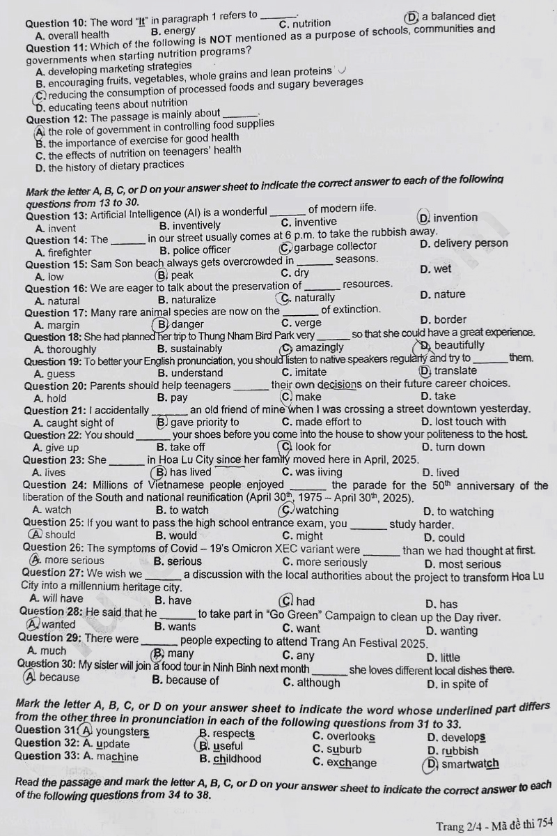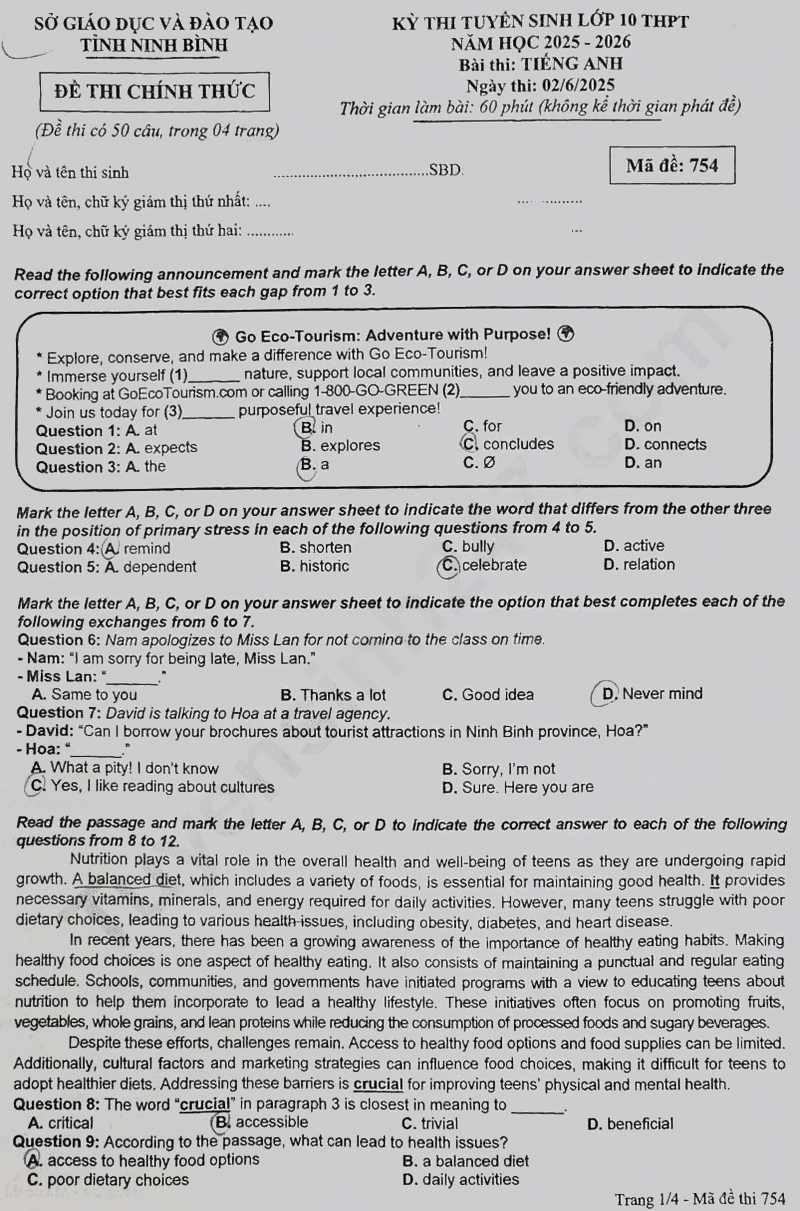 1. Đáp án đề thi vào lớp 10 môn Tiếng Anh Ninh Bình 2025