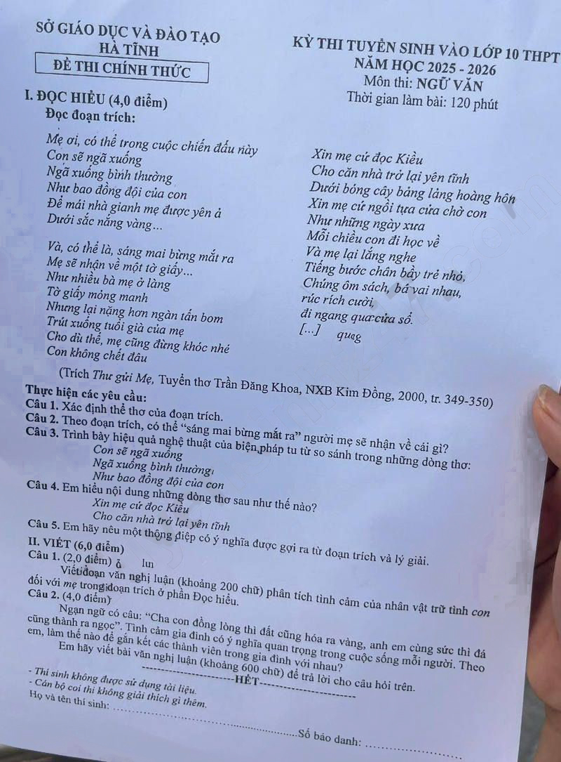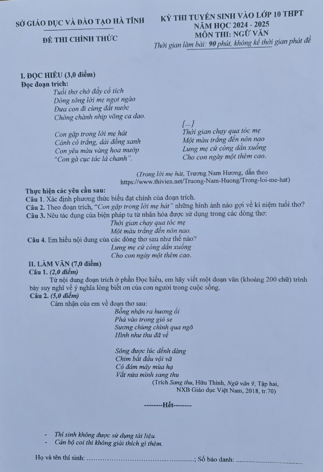 2. Đề thi vào lớp 10 môn Văn Hà Tĩnh 2025