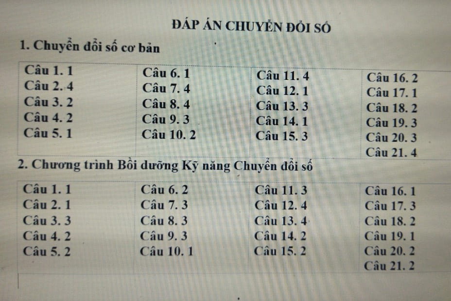 Đáp án module chuyển đổi số trong dạy học - HoaTieu.vn xin chia sẻ Đáp án thi Chuyển đổi số cơ bản, đáp án chương trình bồi dưỡng kỹ năng chuyển đổi số cho giáo viên, giúp các bạn có thêm tư liệu tham khảo, nhanh chóng hoàn thành các bài tập chuyển đổi số cơ bản, bài 1, bài 2, mã đề 218291.