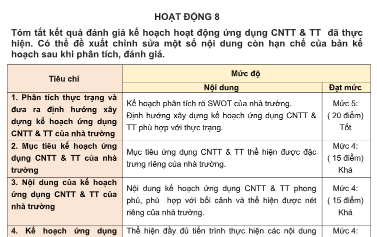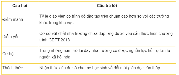 Tình hình, bối cảnh nhà trường; Hoạt động dạy học, giáo dục; thời gian; điều kiện/nguồn lực thực hiện, phân công thực hiện.