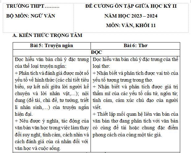 2. Đề cương giữa kì 2 Ngữ văn 11 Kết nối tri thức