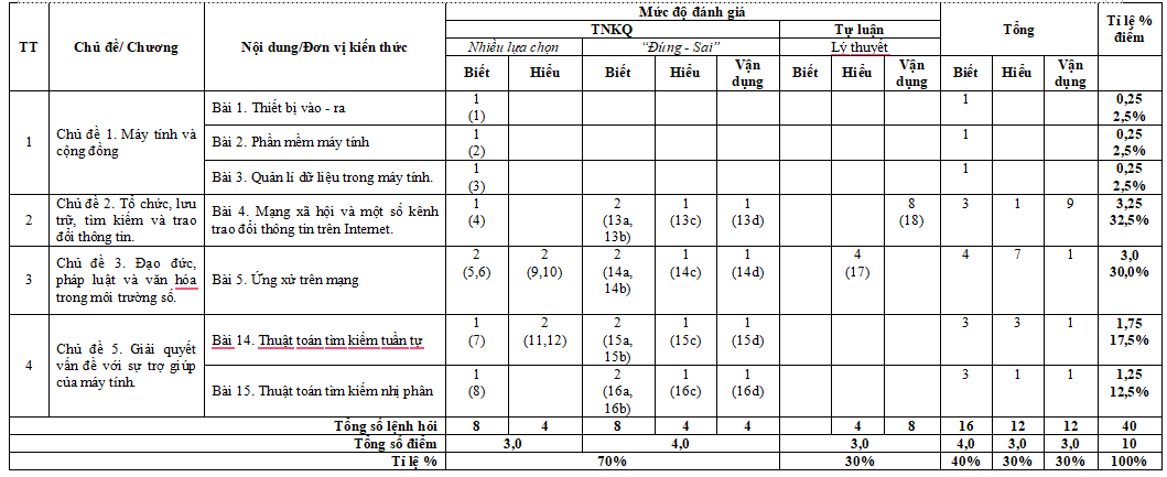 Lưu ý: Đề thi cuối kì 1 Tin học 7 Kết nối tri thức có cấu trúc như sau. Tùy theo yêu cầu của từng Sở mà thầy cô ra đề cho các em nhé.