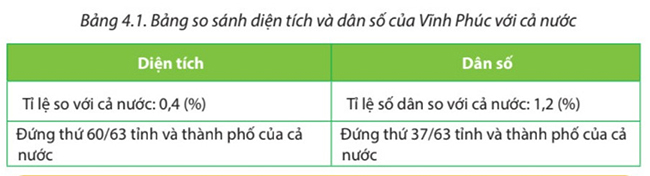 Dựa vào bảng 4.1 và thông tin nêu trên, hãy nhận xét về quy mô diện tích và dân số của tỉnh Vĩnh Phúc so với cả nước năm 2019.