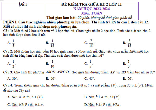 5. Đề thi giữa kì 2 Toán 11 Cánh Diều có đáp án - đề 4