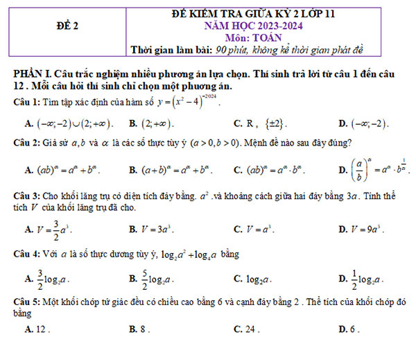 Đề thi giữa kì 2 Toán 11 Cánh Diều