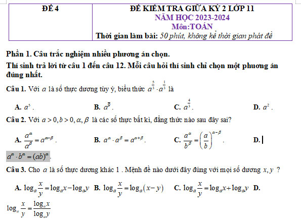 Đề thi giữa học kì 2 Toán 11 Kết nối tri thức được Hoatieu chia sẻ đến bạn đọc trong bài viết sau đây là mẫu đề kiểm tra giữa kì 2 môn Toán lớp 11 sách Kết nối tri thức mới nhất có gợi ý đáp án chi tiết sẽ là tài liệu tham khảo bổ ích cho các em học sinh khi ôn tập giữa kì 2 môn Toán lớp 11. Sau đây là nội dung chi tiết đề thi Toán 11 giữa học kì 2 cấu trúc mới, mời các em cùng tham khảo.
