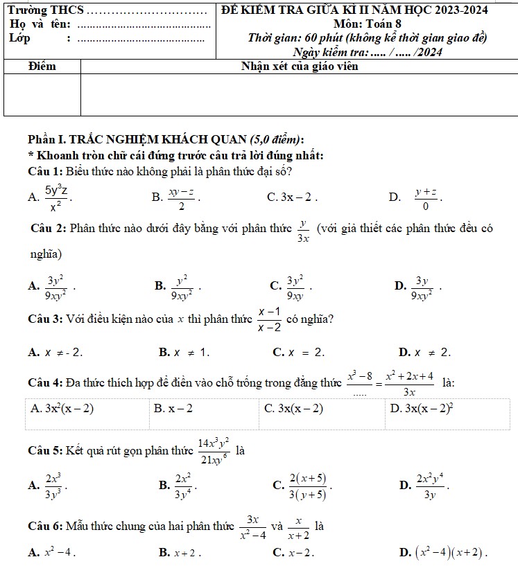 Phân thức đại số. Tính chất cơ bản của phân thức đại số. |