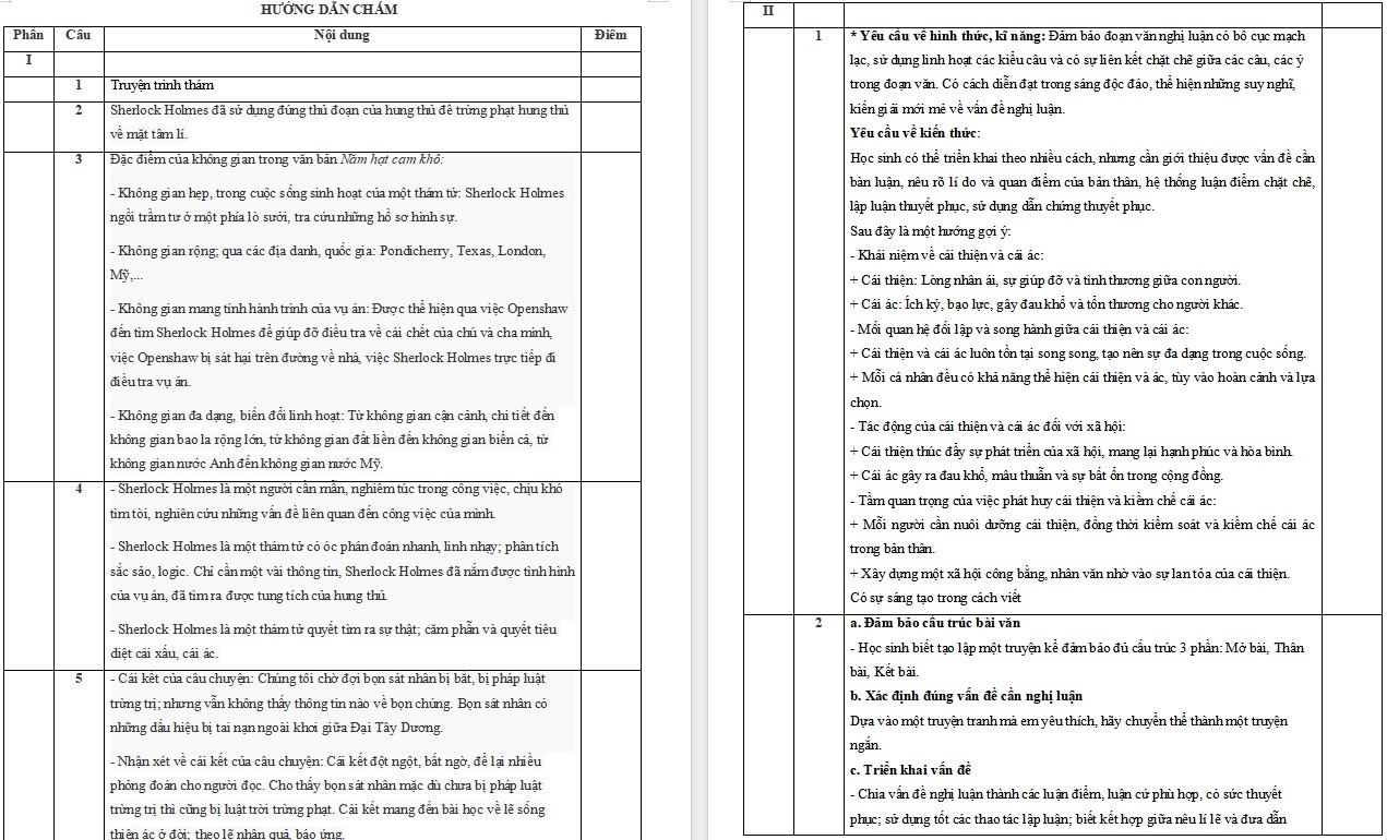a. Đảm bảo cấu trúc bài văn nghị luận - Học sinh biết tạo lập một bài văn nghị luận đảm bảo đủ cấu trúc 3 phần: Mở bài, Thân bài, Kết bài. b. Xác định đúng vấn đề cần nghị luận Bàn luận về ý kiến trên và đề xuất một giải pháp rèn luyện thói quen đọc sách và tự đặt câu hỏi cho bản thân. c. Triển khai vấn đề nghị luận - Chia vấn đề nghị luận thành các luận điểm, luận cứ phù hợp, có sức thuyết phục; sử dụng tốt các thao tác lập luận; biết kết hợp giữa nêu lí lẽ và đưa dẫn chứng. - HS có thể triển khai theo những cách khác nhau, nhưng cần đảm bảo các ý cơ bản sau: 1. Mở bài - Nêu vấn đề: Tự học và vai trò của tự học. - Giới thiệu ý kiến. - Tầm quan trọng của việc đọc và đặt câu hỏi đối với học sinh. 2. Thân bài * Bàn luận về ý kiến của của Richard Paul. - Đặt câu hỏi để hiểu: Việc đặt câu hỏi giúp người đọc tập trung vào nội dung và tìm kiếm câu trả lời cho những điều họ chưa biết. Điều này khuyến khích sự tò mò và ham học, giúp họ hiểu rõ hơn về các khái niệm và thông tin mà tác giả muốn truyền đạt. - Đặt câu hỏi để đánh giá: Bằng cách đặt câu hỏi, người đọc có thể đánh giá và phê phán thông tin một cách tự lập. Điều này đặt họ ở vị trí chủ động trong quá trình đọc sách, từ đó xây dựng khả năng phân tích và đánh giá thông tin một cách toàn diện hơn. - Đặt câu hỏi để đưa ý niệm vào tư duy: Việc đặt câu hỏi giúp người đọc tạo ra những ý niệm cá nhân và đưa chúng vào quá trình tư duy. Câu hỏi không chỉ giúp họ nắm bắt thông tin mà còn kích thích sự sáng tạo và tư duy độc lập. - Kỹ năng đặt câu hỏi là một công cụ tư duy: đặt câu hỏi là cầu nối giữa người đọc và tác phẩm, đồng thời tạo nên một không gian tư duy độc lập và đa chiều. * Thể hiện chính kiến cá nhân. - Đánh giá ý kiến. - Nhận thức, hành động của cá nhân. 3. Kết bài - Khẳng định lại vai trò của việc đọc và đặt câu hỏi. - Đề xuất giải pháp của cá nhân. d. Chính tả, ngữ pháp Đảm bảo chuẩn chính tả, ngữ pháp Tiếng Việt. e. Sáng tạo - Bài viết có luận điểm rõ ràng, lập luận thuyết phục, diễn đạt trong sáng, bài viết thể hiện được sự sáng tạo, độc đáo riêng. - Chữ viết sạch đẹp, rõ ràng, văn phong lưu loát; không mắc lỗi chính tả, lỗi dùng từ, đặt câu. |