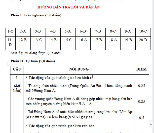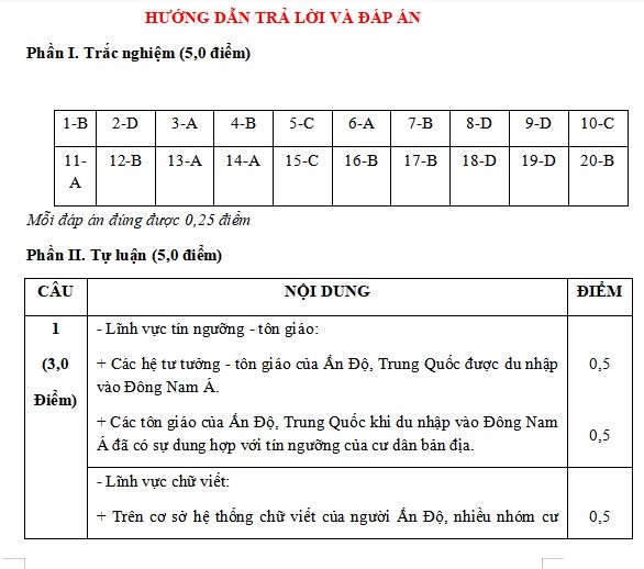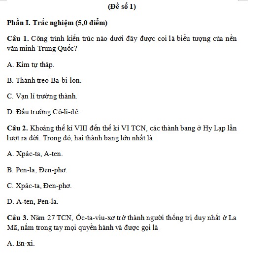 Đáp án đề thi Lịch sử - Địa lớp 6 cuối kì 1