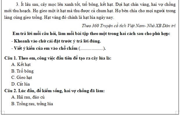 3. Dựa theo nội dung bài đọc, khoanh vào chữ cái đặt trước câu trả lời đúng hoặc làm theo yêu cầu cho mỗi câu hỏi dưới đây:
