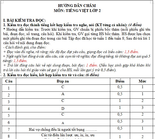 2. Đáp án đề thi học kì 1 môn Tiếng Việt lớp 2 sách Cánh Diều