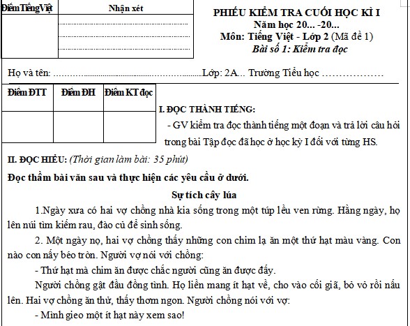 Môn: Tiếng Việt (Bài đọc) – Lớp 2 (Thời gian: 35 phút)