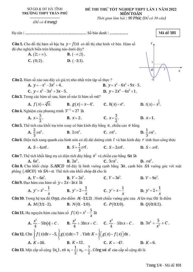 Đề thi thử thpt quốc gia môn Toán năm 2022 có đáp án của trường THPT Trần Phú tỉnh Hà Tĩnh.