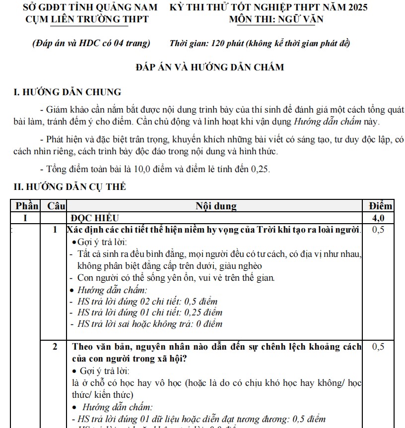 Đáp án đề khảo sát liên trường sở Quảng Nam môn Ngữ văn