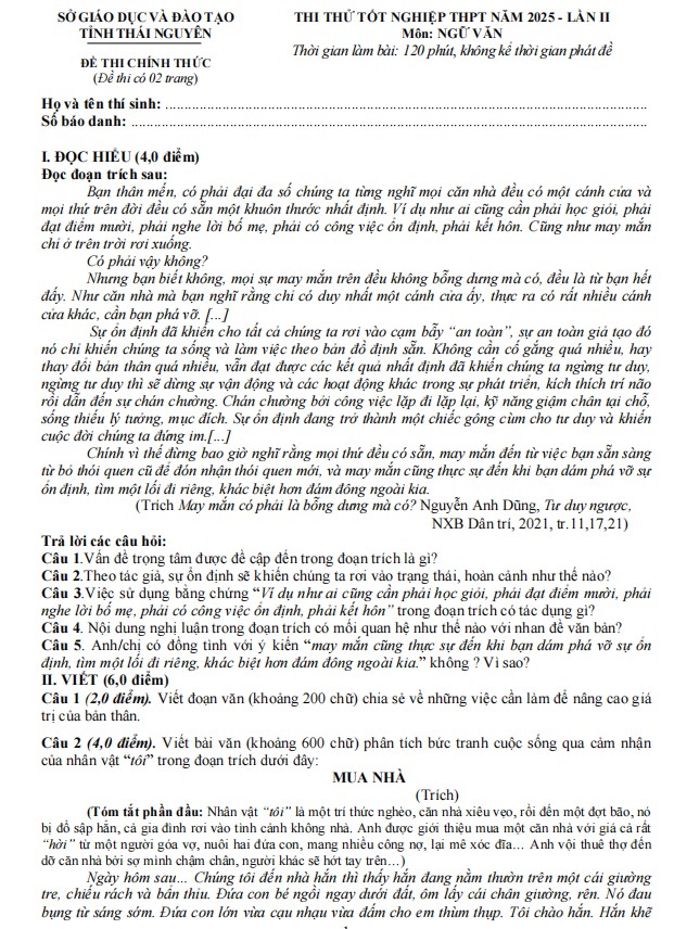 Đề thi thử sở Thái Nguyên 2025 môn Văn lần 2