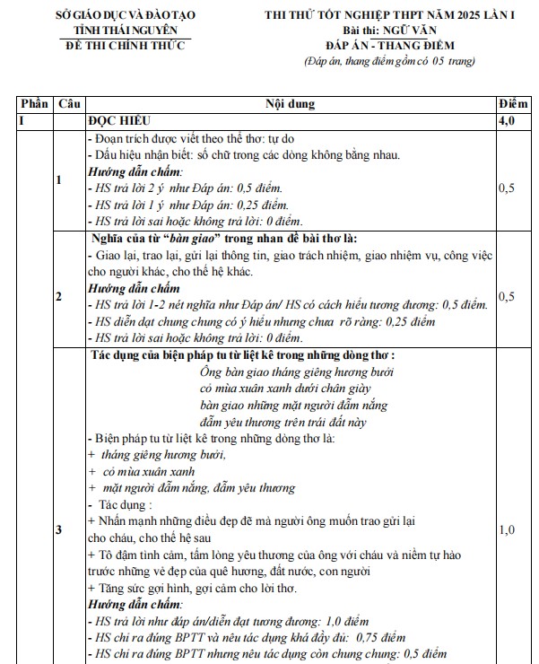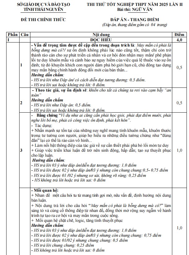 Sở Giáo dục và Đào tạo Thái Nguyên vừa công bố đề thi thử tốt nghiệp THPT năm 2025 môn Văn, nhằm giúp học sinh lớp 12 rèn luyện và đánh giá năng lực trước kỳ thi chính thức. Đề thi được xây dựng bám sát cấu trúc và mức độ của đề tham khảo do Bộ GD&ĐT công bố, bao gồm đầy đủ các dạng câu hỏi. Bài viết cung cấp đầy đủ đề thi, đáp án hỗ trợ học sinh ôn tập hiệu quả trong giai đoạn nước rút.