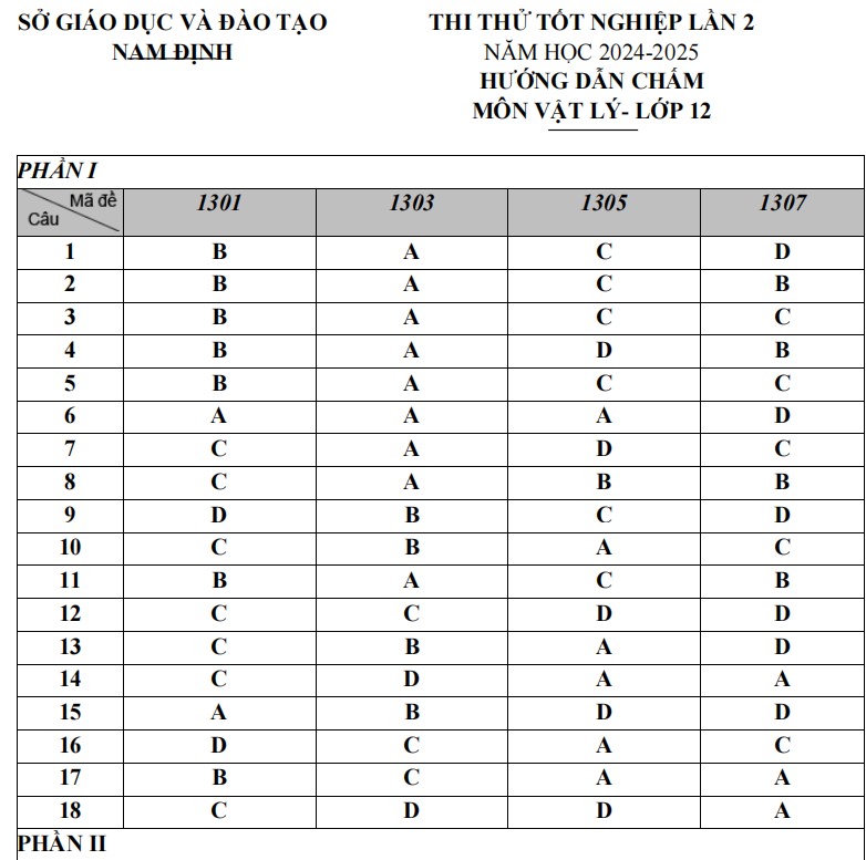 2. Đáp án đề thi thử THPT 2025 môn Vật lí Nam Định