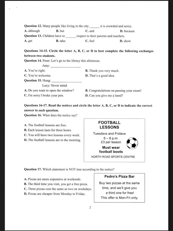 Question 14-16: Circle the letter A, B, C, or D to best complete the following exchanges.