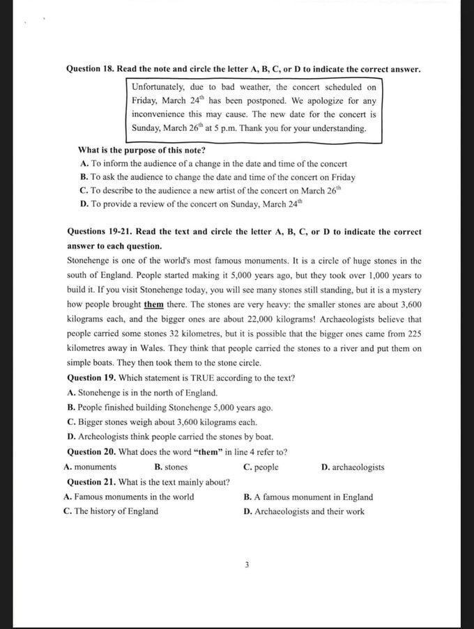 Question 18: Read the message and circle the letter A, B, C or D to indicate the correct answer.